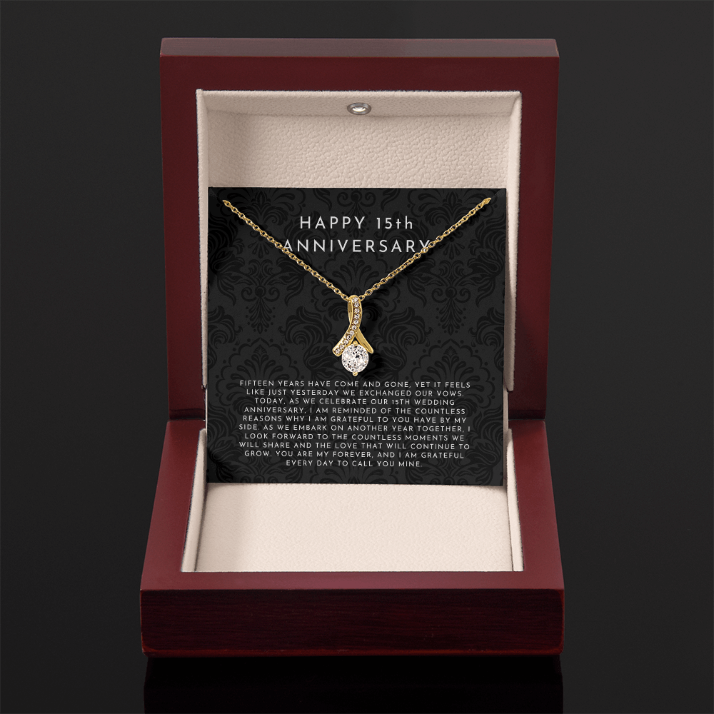 Your happy fifteen year anniversary necklace is lovingly packaged in a complimentary soft touch box for easy gifting. Elevate your presentation by upgrading to the mahogany style luxury box, which features a brilliant LED spotlight.
