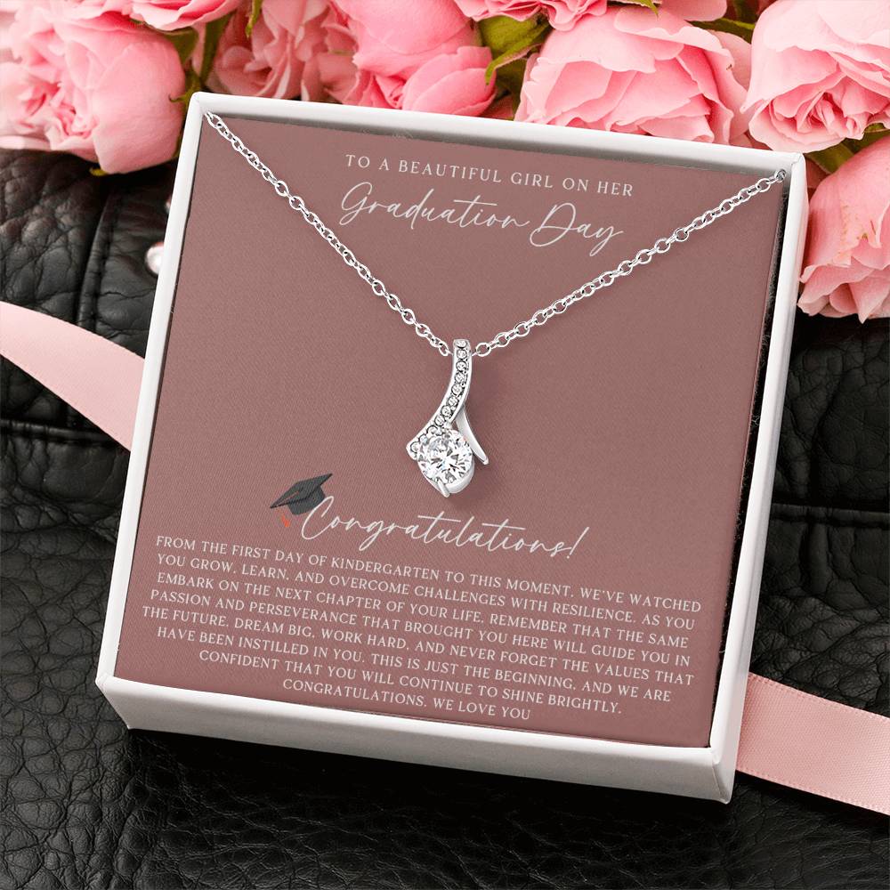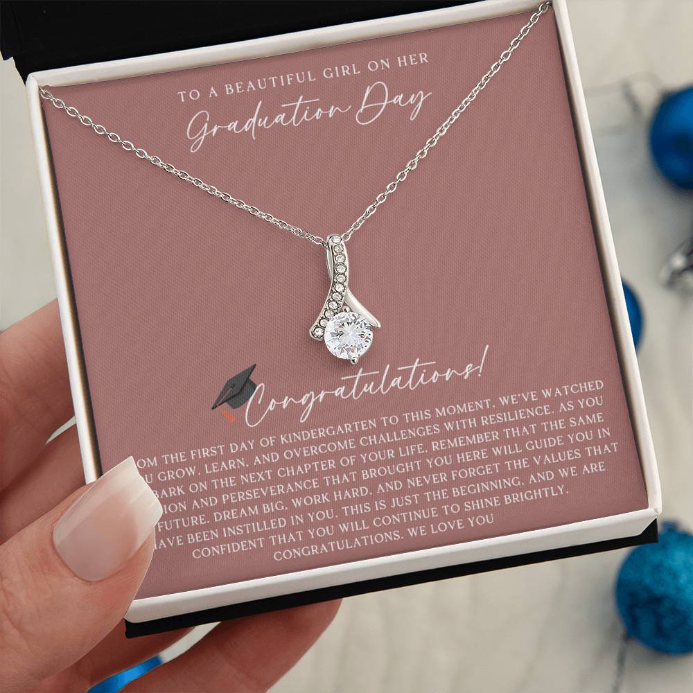 Give your Graduate the gift that symbolizes your never-ending love. This Alluring Beauty necklace features a beautiful petite ribbon shaped pendant. It is the perfect and unique gift for that special someone this holiday season.