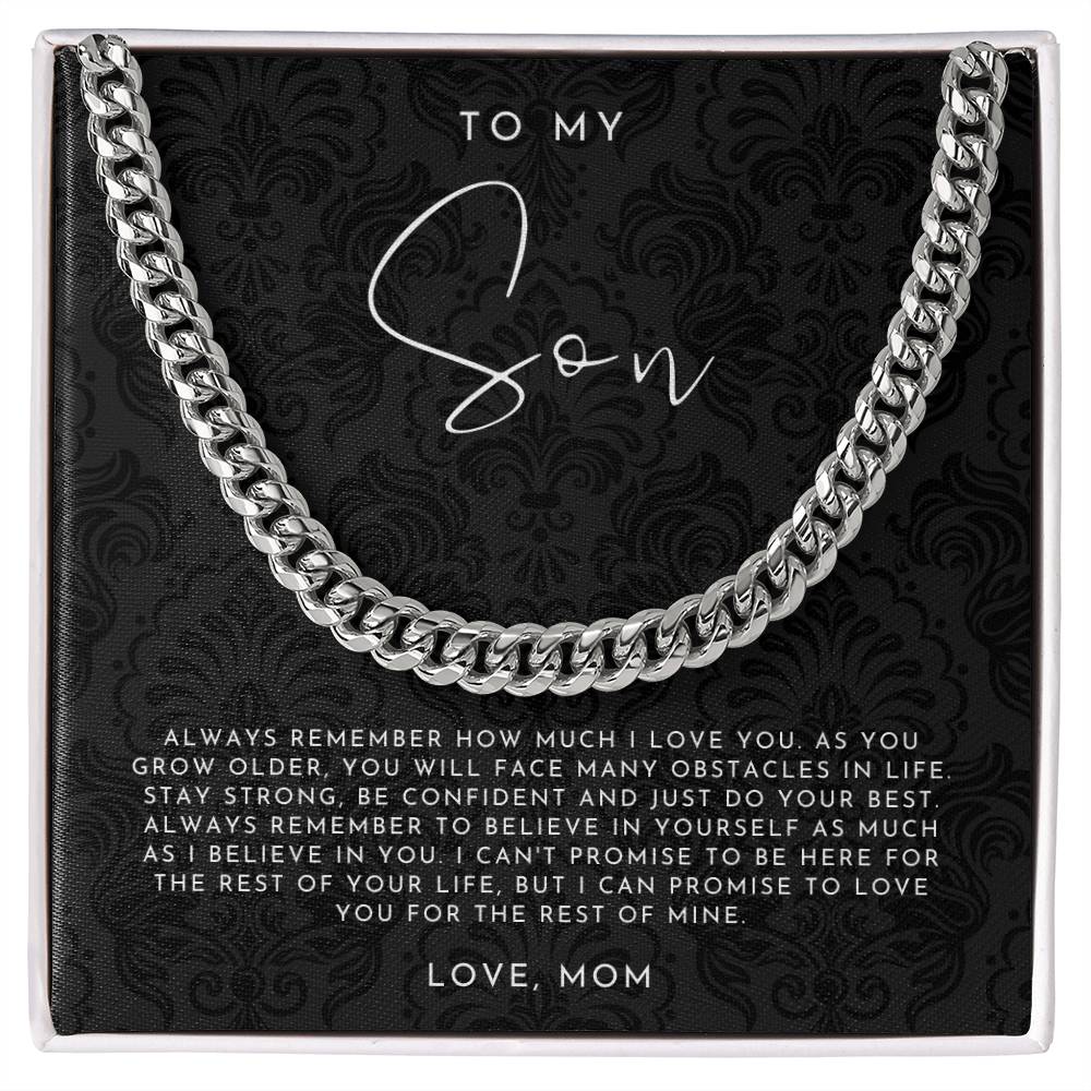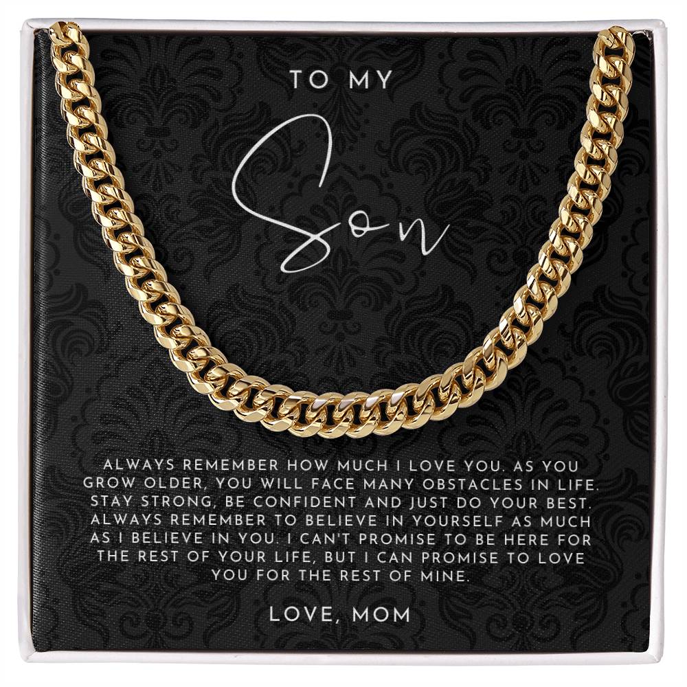 "To My Son. Always remember how much I love you. As you grow older, you will face many obstacles in life. Stay strong, be confident, and just do your best. Always remember to believe in yourself as much as I believe in you. I can't promise to be here for the rest of your life, but I can promise to love you for the rest of mine. Love Mom."