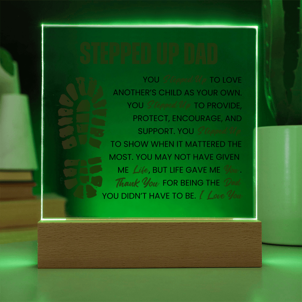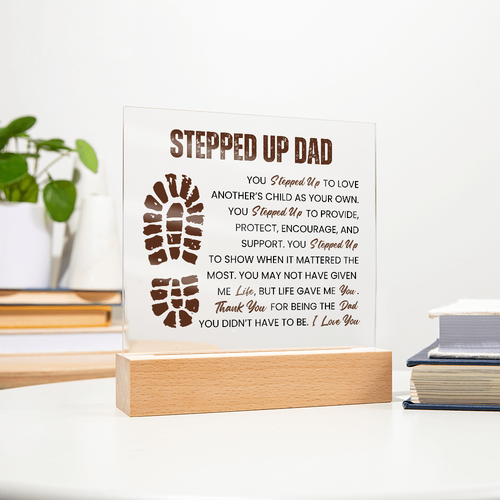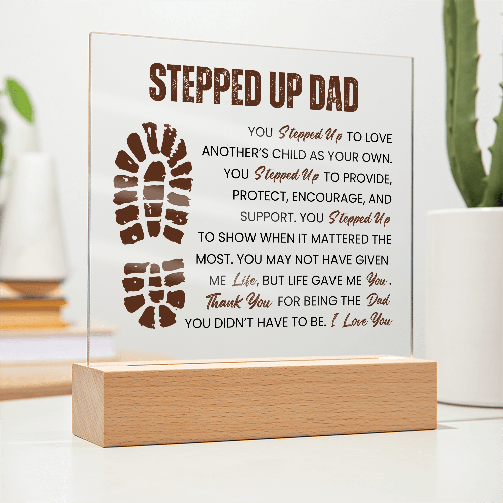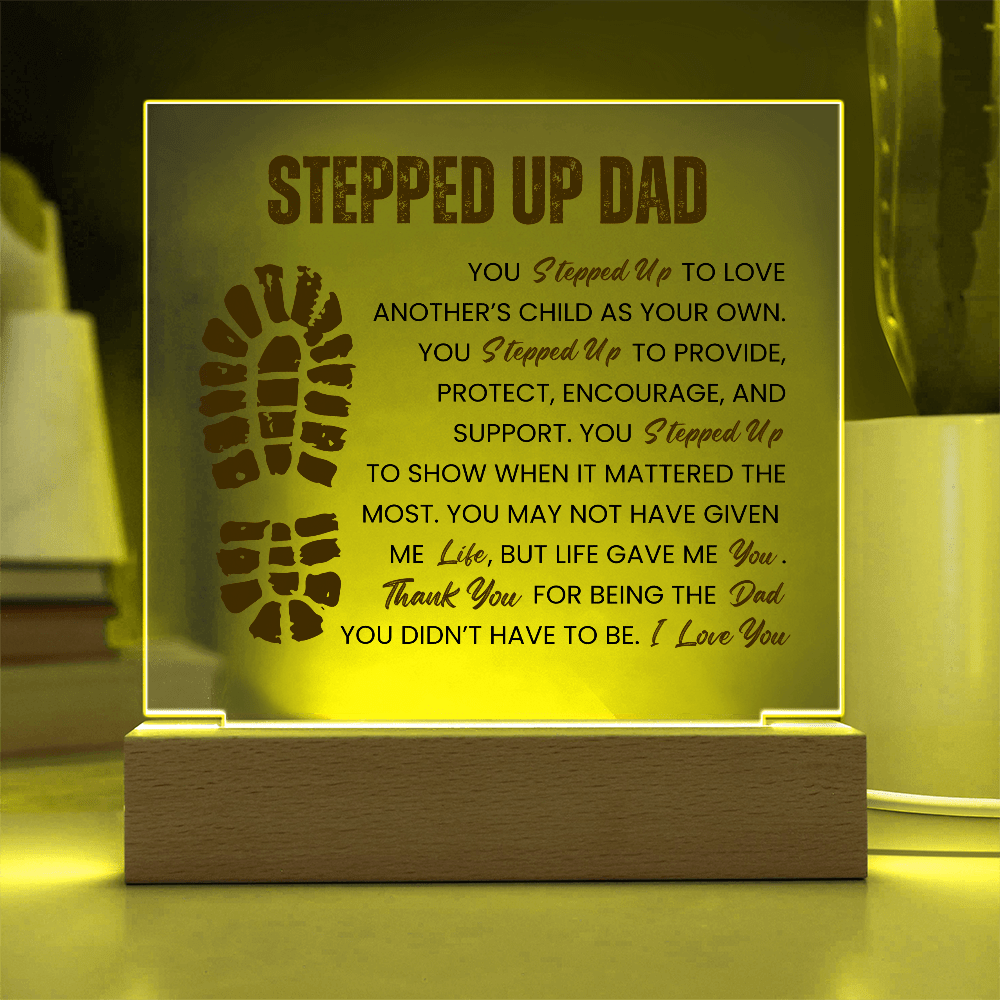 Give your Stepped Up Dad the gift that symbolizes your never-ending love. This premium Printed Square Acrylic Plaque features a vibrant design and a color-changing LED base. It is the perfect and unique gift for that special someone this holiday season.