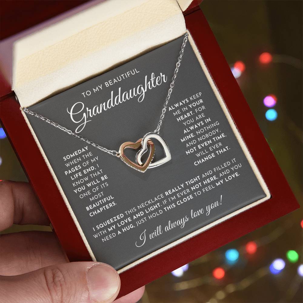 Your To My granddaughter interlocking hearts necklace is lovingly packaged in a complimentary soft touch box for easy gifting. Elevate your presentation by upgrading to the mahogany style luxury box, which features a brilliant LED spotlight.