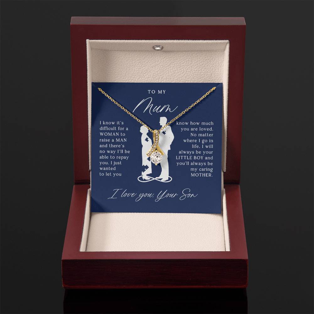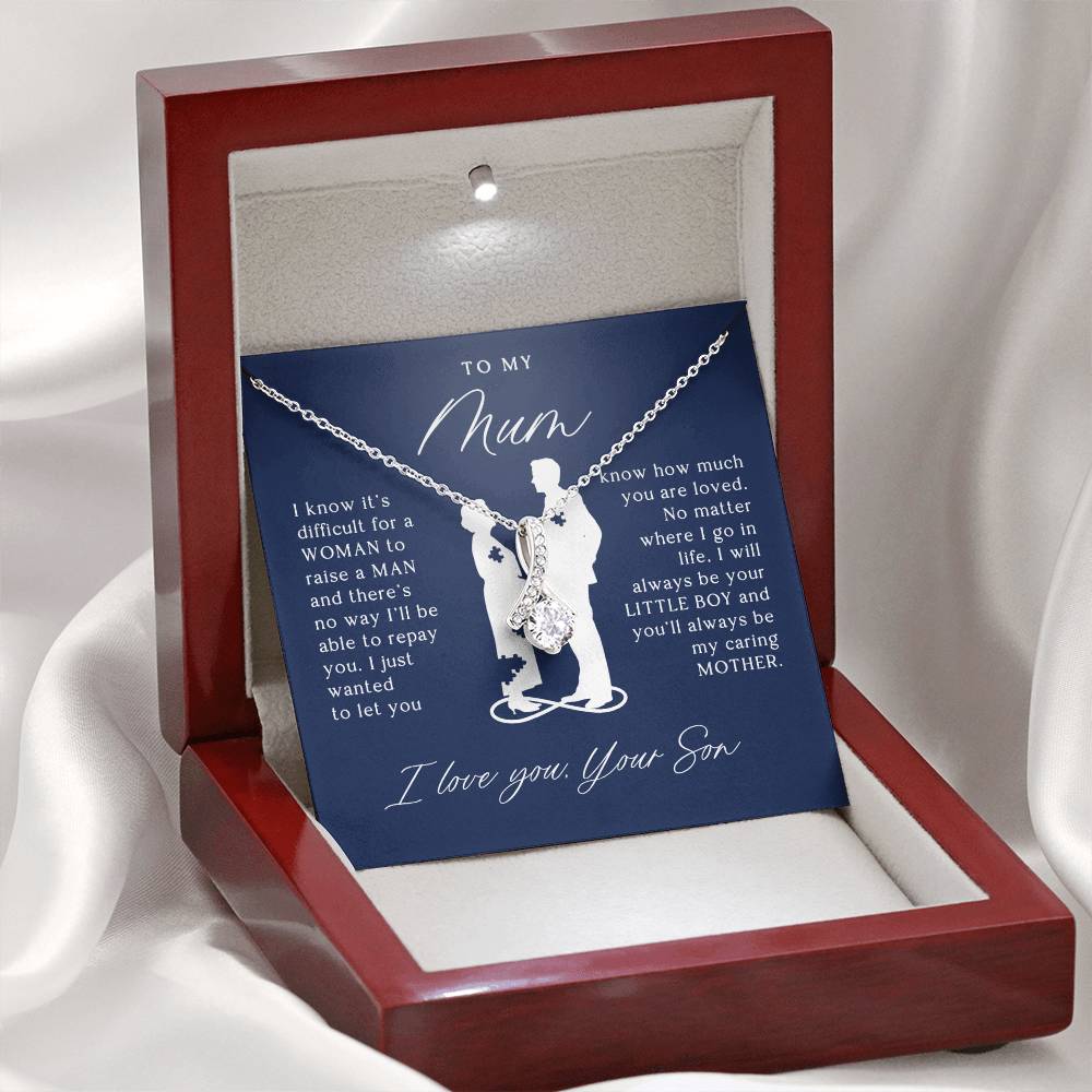 Your To My Mum from son necklace is lovingly packaged in a complimentary soft touch box for easy gifting. Elevate your presentation by upgrading to the mahogany style luxury box, which features a brilliant LED spotlight.